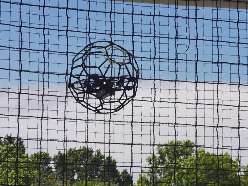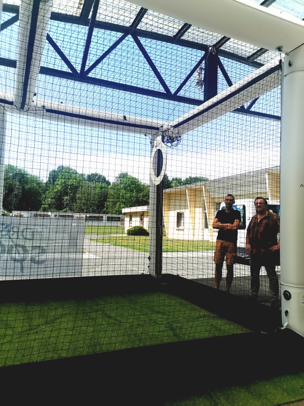 Pour leur démonstration, l’équipe de Liévin a installé une grande cage gonflable (6x3x3 m) équipée de "buts" en suspension, afin de jouer au jeu de drone Soccer.