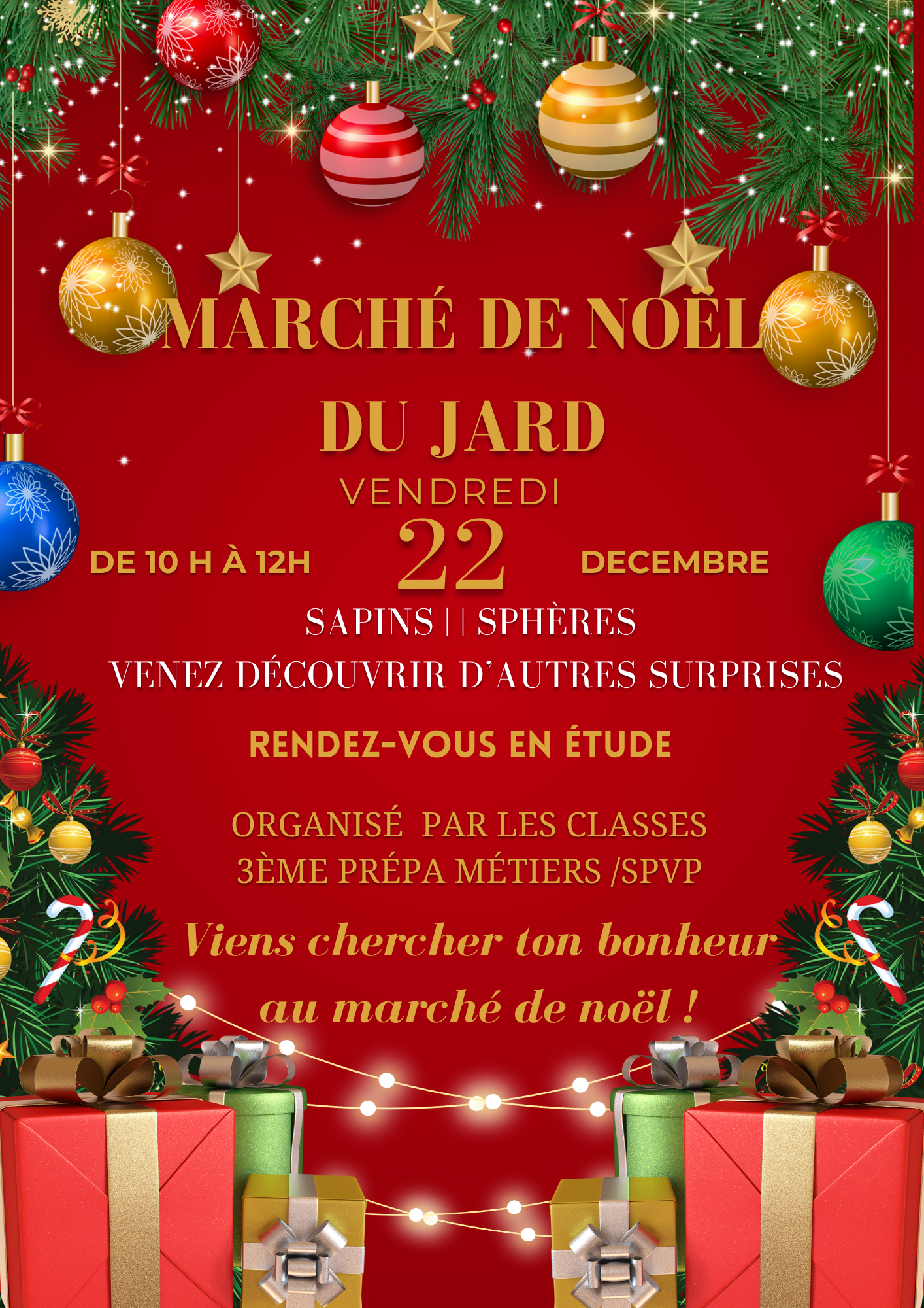 Vendredi 22 décembre de 10h à 12h en salle d’études aura lieu le marché de Noël organisé par les élèves de SPVP et 3ème Prépa Pro.