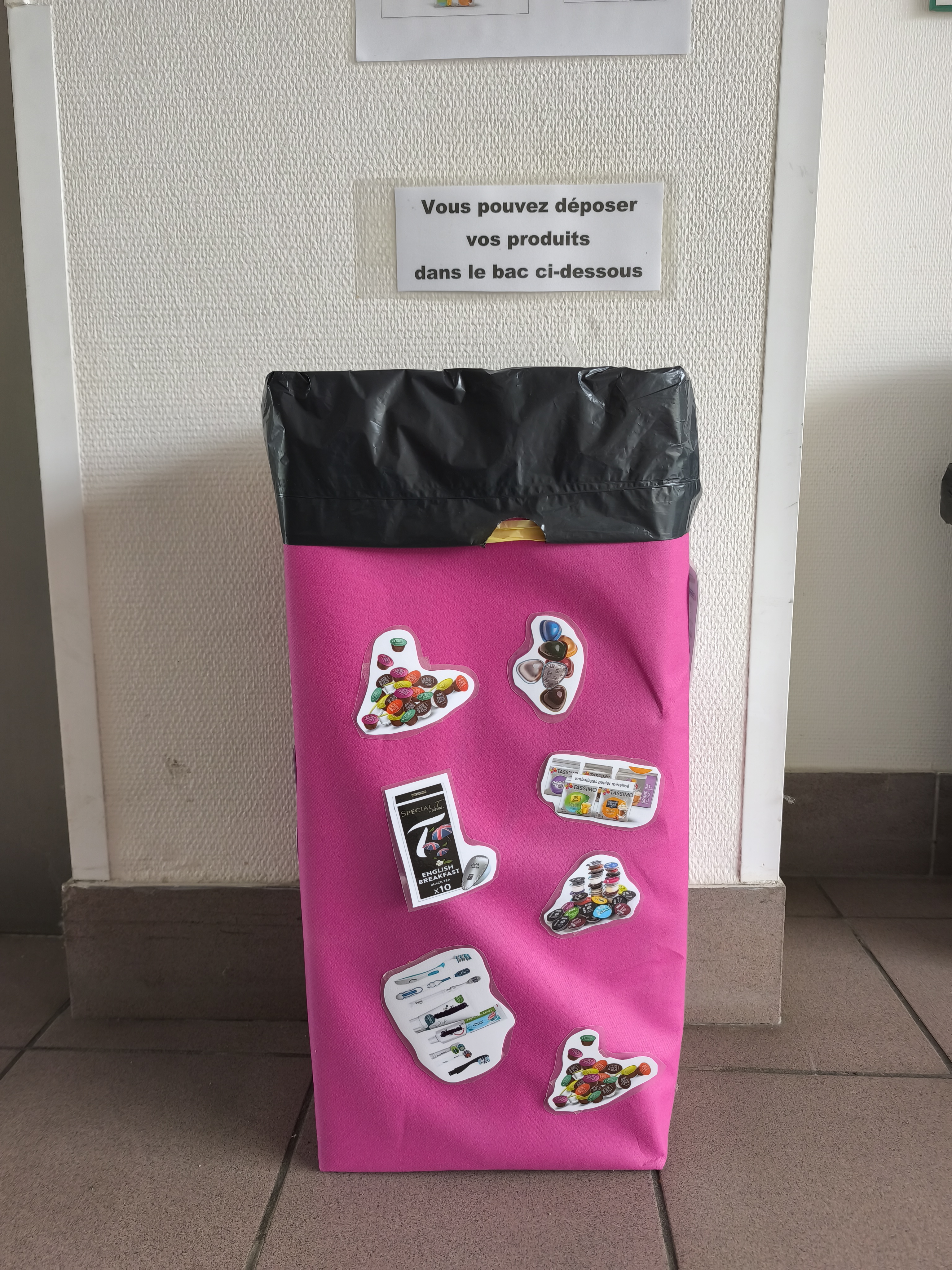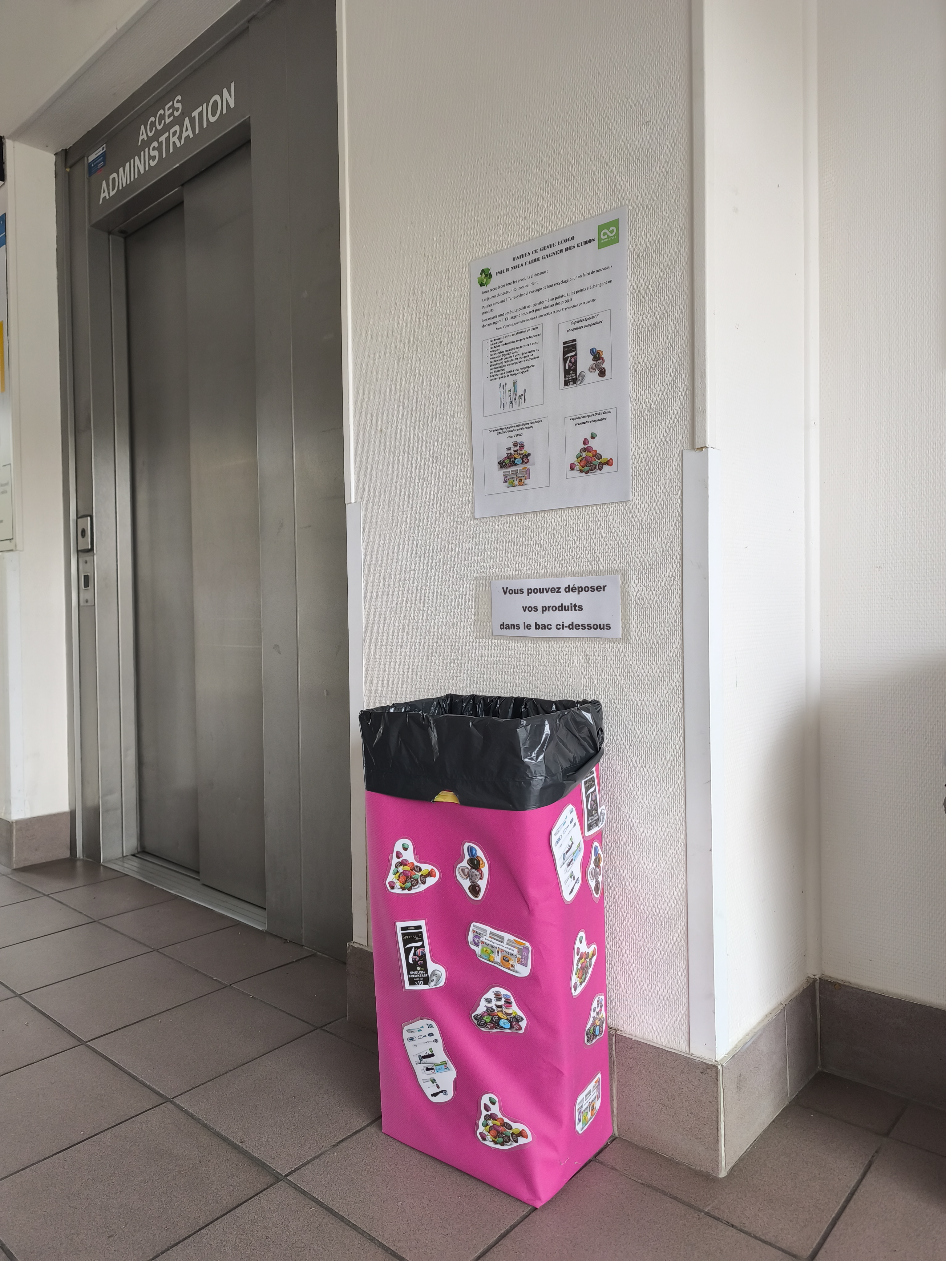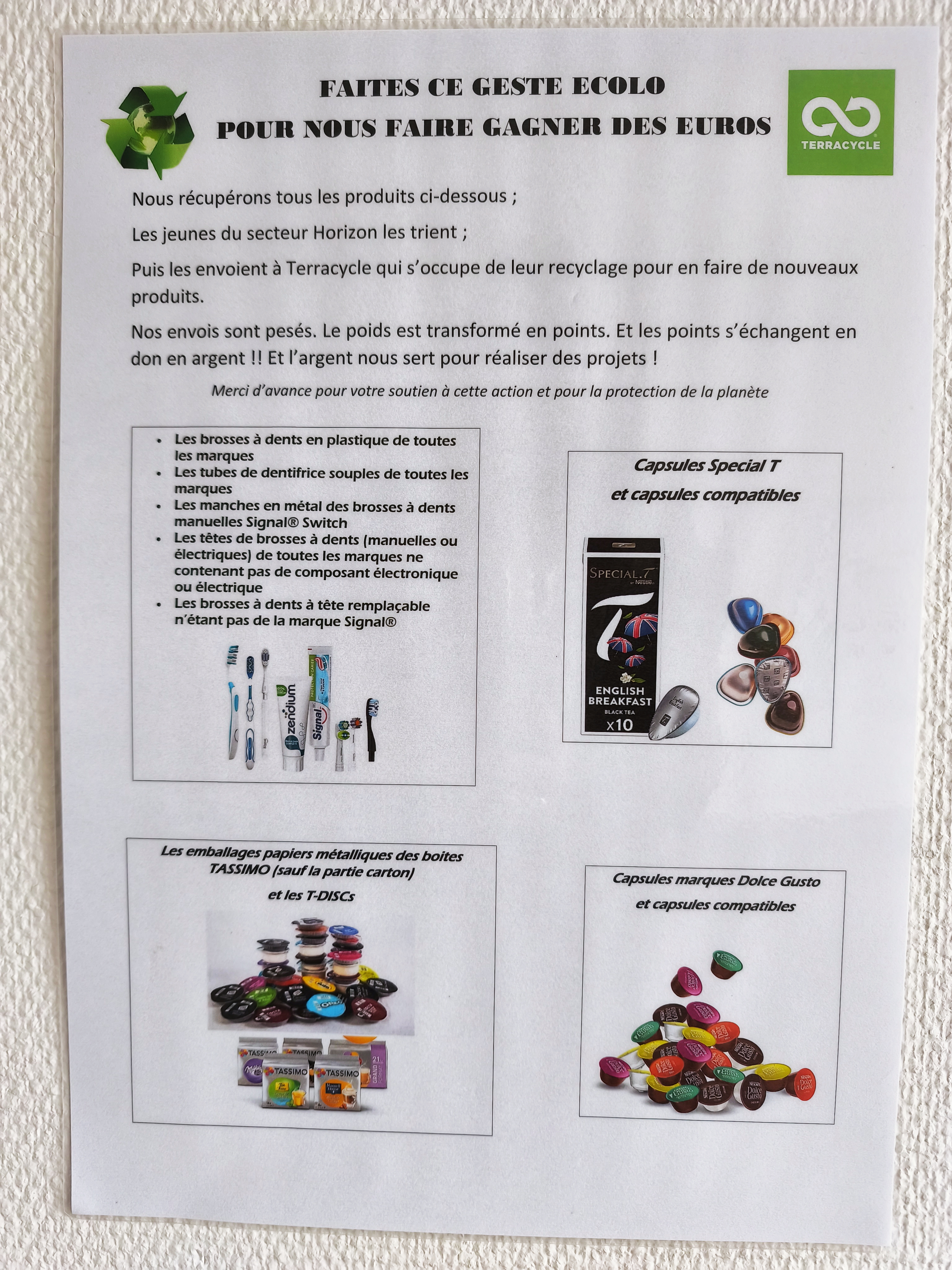Capsules et emballages de café, tubes de dentifrice souple, brosses à dents... (voir le détail sur l’affiche ci-dessous) doivent être déposés dans la boîte rose située dans le sas.