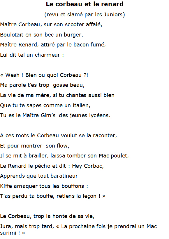 Le spectacle de danse a été suivi d’une interprétation très moderne et cocasse de la fable de la Fontaine "Le corbeau et le renard", puis d’un goûter et du vernissage d’une exposition d’oeuvres, en salle d’études.