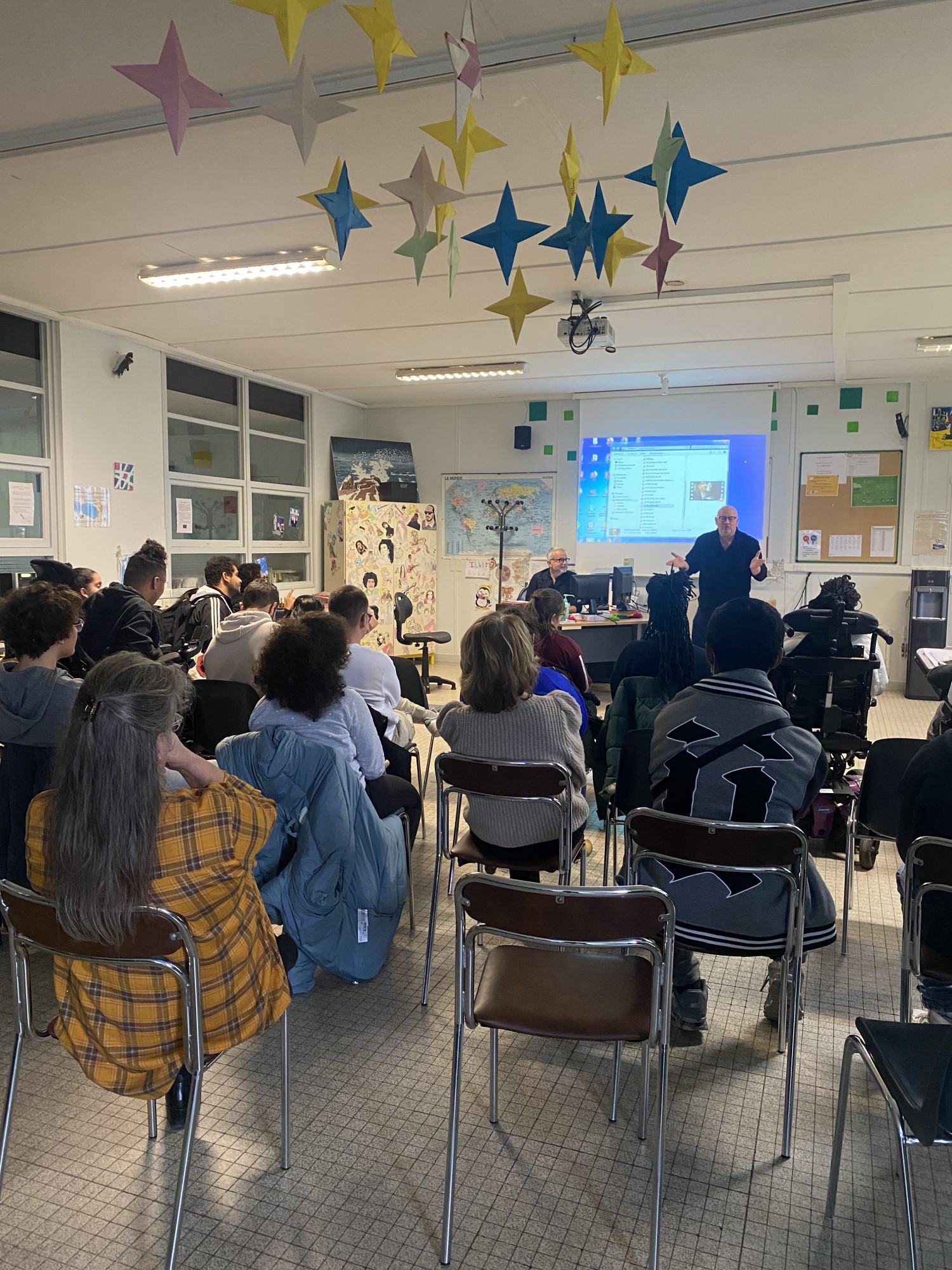 Les élèves ont échangé longuement avec lui à ce propos et à propos du cinéma et de la réalisation.