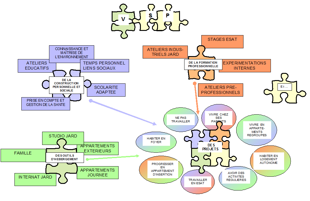 - Un parcours structuré dans le temps, avec des âges pour donner des repères symboliques : 16-18 ans, on s’évalue, 18-20 ans, on expérimente (en stages) le projet que l’on a construit avec travail (SPVP) ou sans travail (SPVS). Après 20 ans, si nécessaire, on complète les expériences…